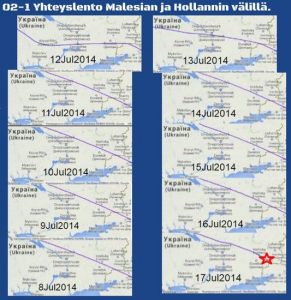 (mh17 lensi saman reitin edestakaisin joka päivä, 17.7 se vain lensi reilu 10km pohjoisempaa (Horlvinka:n yli) sään takia, suora reitti olisi mennyt Donetskin yli ja suoraan buk:n yli. Ohjuksen osuessa mh17 oli 6km suunniteltua lentotien keskikohtaa pohjoisempana.