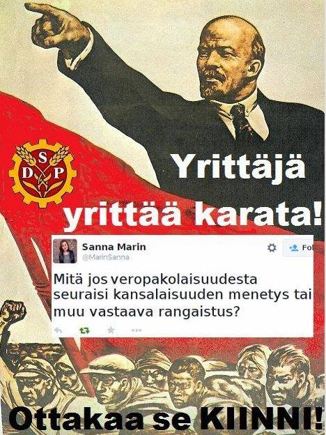 Niin oudolta kuin se kuulostaakin, olen tässä demarien kiintiöräyhän kanssa samaa mieltä. Jos eivät Suomen verot maita, ei tarvitse Suomen palveluidenkaan kelvata. Hankkikoon uuden passin Jerseysaarilta.