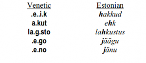 The following table illustrates some Estonian words that are quite parallel to Venetic words, with the Estonian showing an H, in locations where the Venetic shows dots. This repetition of the same pattern is very revealing, and evidence that by the laws of probability these are not likely to be pure coincidences.