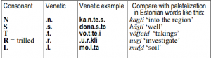 See examples in Table 5.3 where the Estonian palatalizations are not marked, but we point them out by underlining the letter.