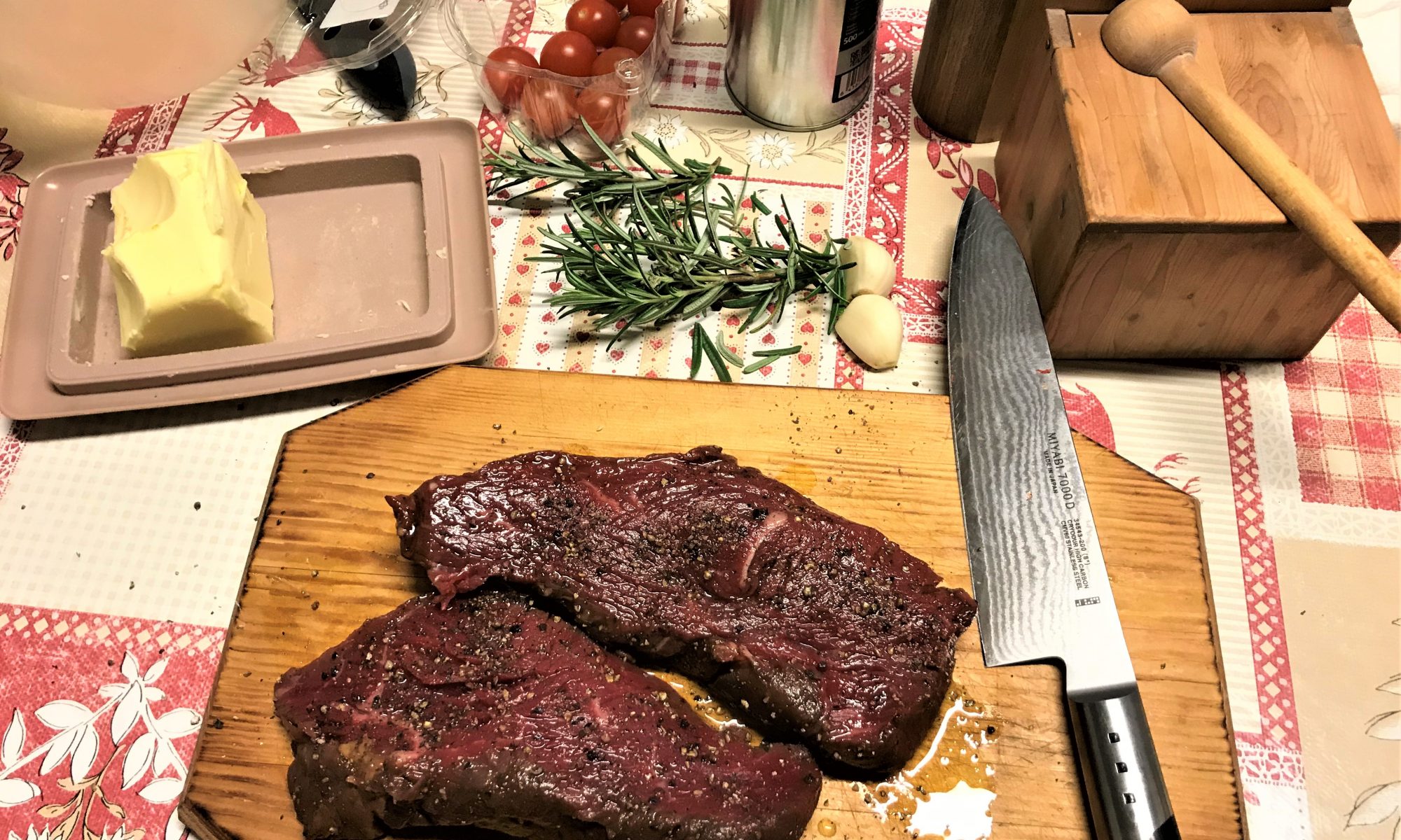 Sitten pihvit pannulle ja paistorasvaan pari rosmariinin oksaa ja sekä kaksi isoa kynttä Peipsijärven valkosipulia siivuina.